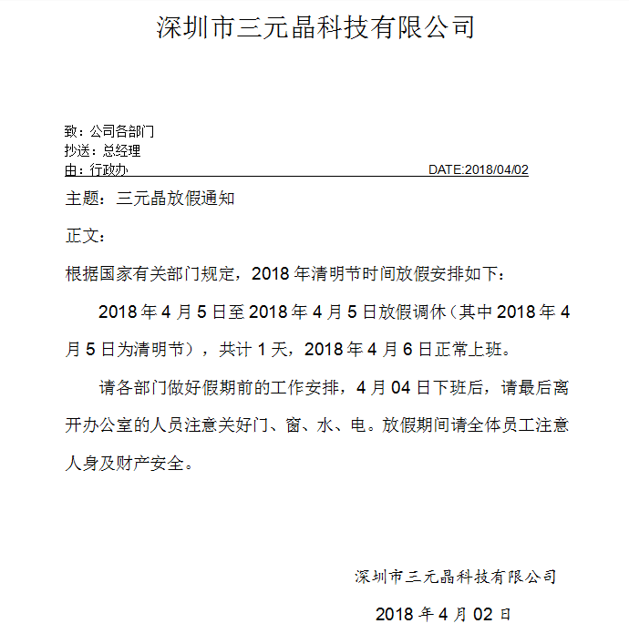 根據(jù)國務(wù)院辦公廳通知精神與本公司的實(shí)際情況結(jié)合,三元晶科技有限公司2018年“清明”放假安排: 2018年4月5日(周四)至2018年4月5日(周四)放假1天;于2018年4月6日(周五)正式上班。